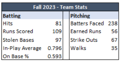 - 10/15 @ Jaquith: vs. Lady A's (L 4-2 in 6) & Rebels (L 8-7) TOUGH GAMES